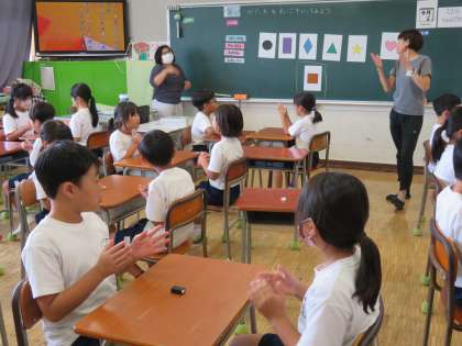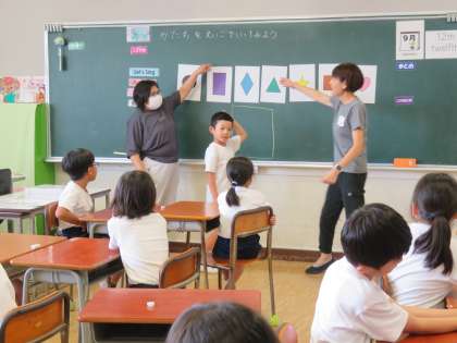 2年生は、外国語活動でALTのマリア先生と一緒に「かたちを英語で言ってみよう」の学習に取り組んでいました。