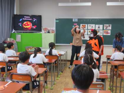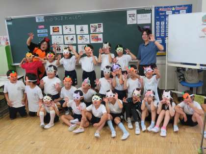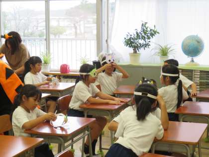 10/24 授業の様子(2) 公開日 2024/10/24 更新日 2024/10/24 できごと 2年生は、外国語活動「ハロウィーンを楽しもう」で、ハロウィーンのマスク作りをしました。仮装したALTのマリア先生から、作り方を英語で聞きながらマスクを完成させました。
