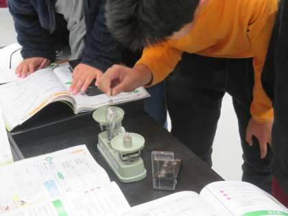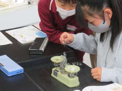 身のまわりの物の重さを上皿天びんを使って、慎重に測っていました。
