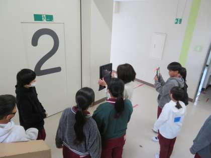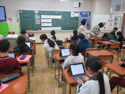 11/20 英語の授業 公開日 2024/11/20 更新日 2024/11/20 できごと 5年生は、ALTのマリア先生と一緒に、校舎内を道案内する英語表現を学種していました。 タブレットを使って、右に曲がる、左に曲がる、階段を上がるなど楽しく友だちに伝えていました。