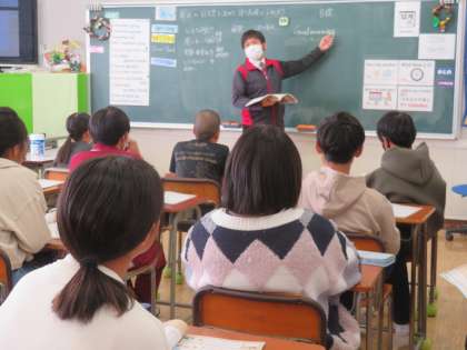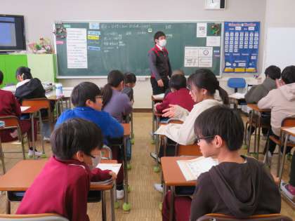 12/10 英語の授業 公開日 2024/12/10 更新日 2024/12/10 できごと 6年生は、西中学校の英語担当の先生と英語の文を読む学習に取り組んでいました。 「Good morning」などの発音の仕方を確認していました。