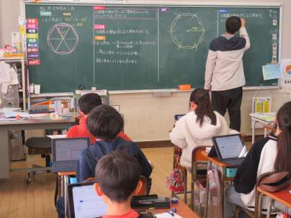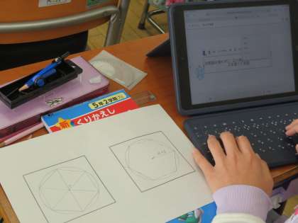 5年生は、算数「正多角形と円」で、分度器を使わずに正六角形を書く学習にチャレンジしました。