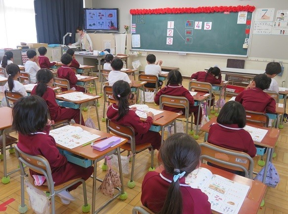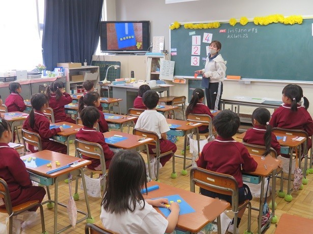 1年生は、算数「1から5までのかず」に挑戦していました。物の数え方をブロックを使って何度も体験していました。