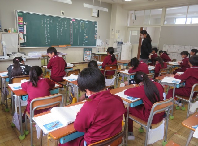 4/18 国語の授業 公開日 2025/04/18 更新日 2025/04/18 できごと 3年生は、国語「春風をたどって」で、「登場人物・場所・時間・気持ち」をキーワードにして物語を読み進めていました。 教科書をしっかりと両手で持って、よい姿勢で音読をしていました。
