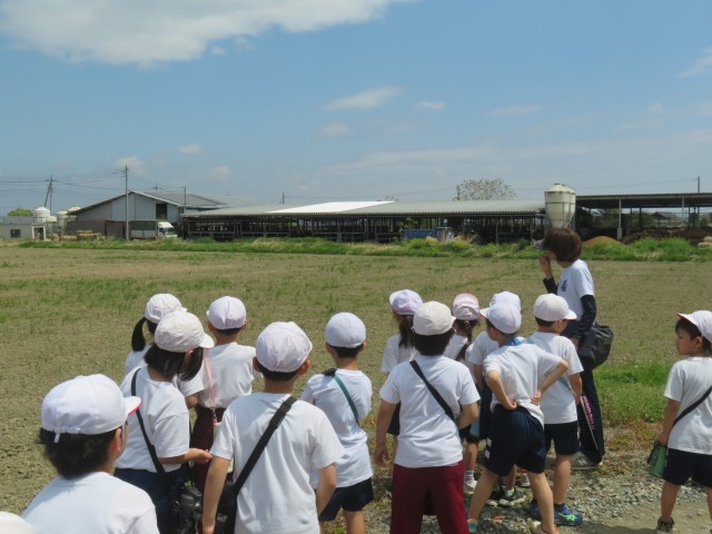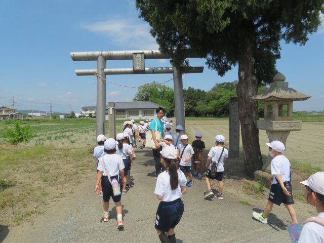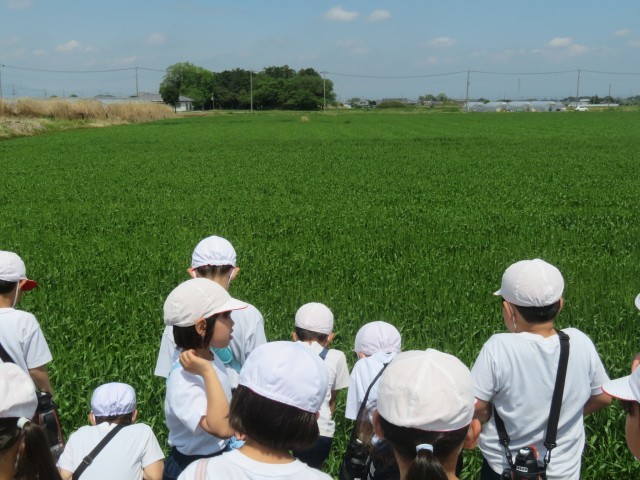 牛を飼っている建物も発見しました。牛の鳴き声や、牛のにおいも感じ取りました。この時期は、たくさんの麦が青々としていたり、学校の近くに「平地神社」があることも発見しました。「学びいっぱい」の校外学習でした。