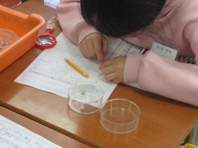 今日の授業は、「ホウセンカ、ひまわり、オクラ、大豆」の種をよく観察して、「色、形、大きさ」をくらべていました。
