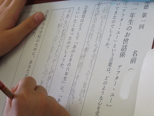 4/24 道徳の授業 公開日 2025/04/24 更新日 2025/04/24 できごと 6年生は、道徳「一年生のお世話係 ~アフター・ユー」で、「クラスや学校のためにできることは何か」を教材文をとおして、話し合いました。 昨年度の6年生の姿を思い浮かべながら、「自分だったら・・・」と考えて、友だちと意見交流を行いました。