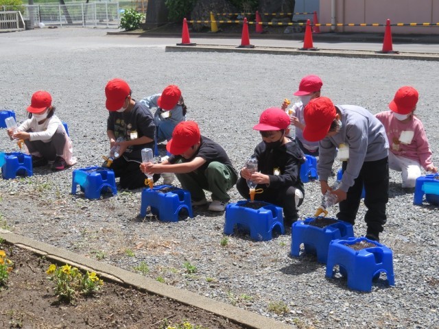 5/7 あさがおの種まき 公開日 2025/05/07 更新日 2025/05/07 できごと 1年生は、生活科で「あさがおの種まき」を行いました。小さな種を、丁寧に自分の植木鉢にまきました。 「きれいな花が咲きますように」「はやく大きくなりますように」など、一人一人が願いを込めて水をあげていました。