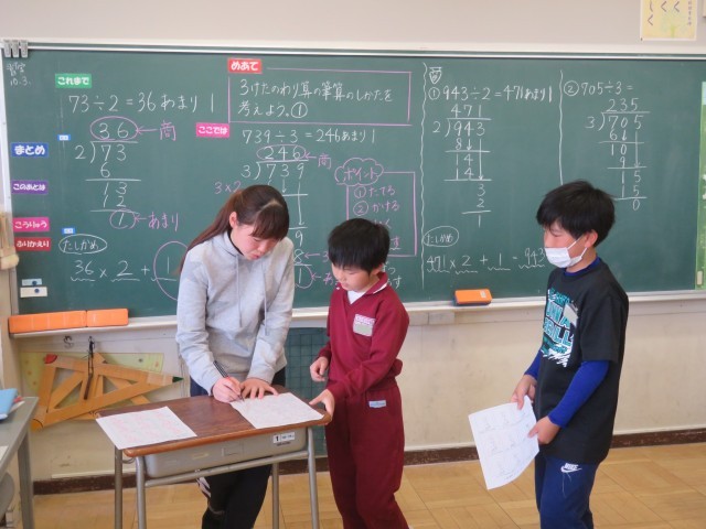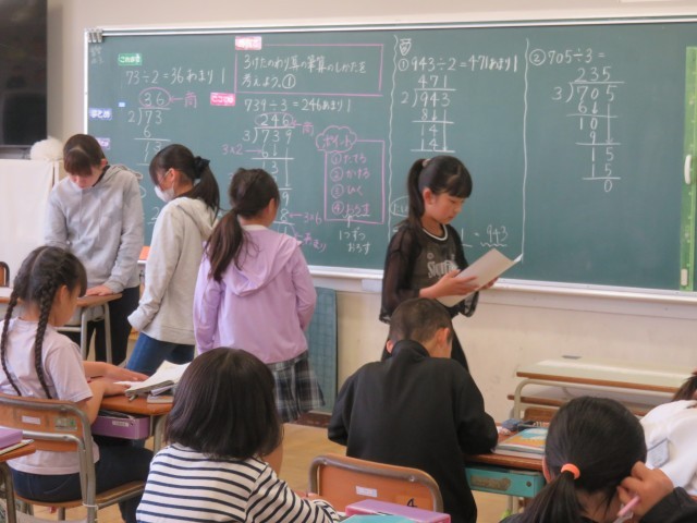 5/8 算数の授業 公開日 2025/05/08 更新日 2025/05/08 できごと 4年生は、算数「3けたのわり算の筆算」に取り組んでいました。これまで学習した「たてる・かける・ひく・おろす」を使って練習問題にチャレンジしていました。