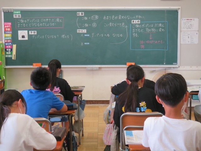 5/23 理科の授業 公開日 2025/05/23 更新日 2025/05/23 できごと 6年生は、昨日の「だ液のはたらきについての実験」の結果を確かめ合って、「わかったこと」をまとめました。 「問題 →予想 →実験 →結果 →わかったこと →まとめ」の流れがわかりやすい授業でした。