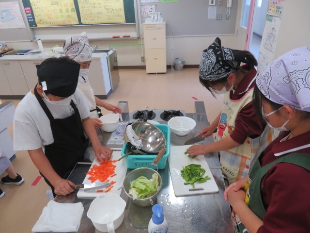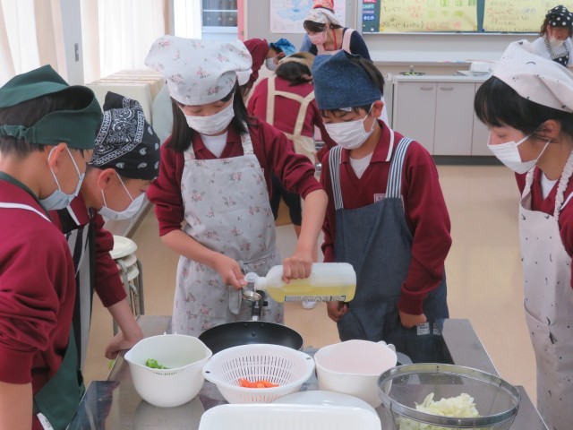 「野菜いため」の調理実習の様子です。炒めるための油の量も慎重に量っていました。