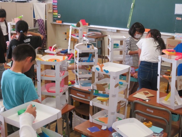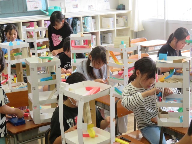 5/29 図工の授業 公開日 2025/05/29 更新日 2025/05/29 できごと 4年生は、図工で紙の切り方、接着の仕方を工夫して、ビー玉が転がる塔を作っていました。みんな夢中で作品作りに向き合っていました。