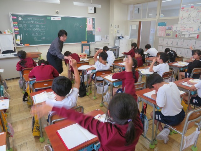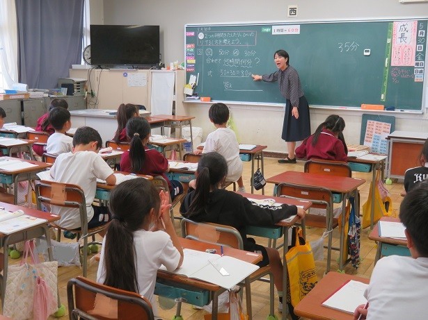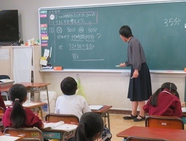 3年生は、算数「時こくと時間」で、教頭先生による特別授業を行いました。これまで学習した「1時間=60分」を考えるヒントにして、時間のたし算とひき算にチャレンジしました。