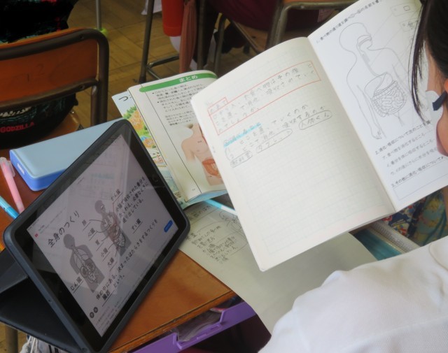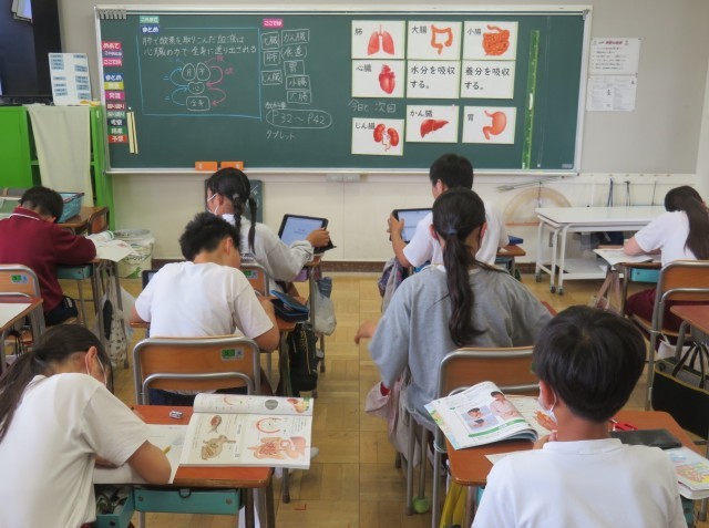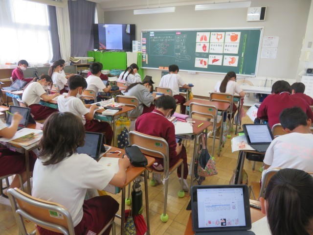 6/4 理科の授業 公開日 2025/06/05 更新日 2025/06/05 できごと 6月4日(水)、6年生は、理科「ひとの体のつくりとはたらき」で、心臓や肺などの「ぞう器」について調べてまとめていました。