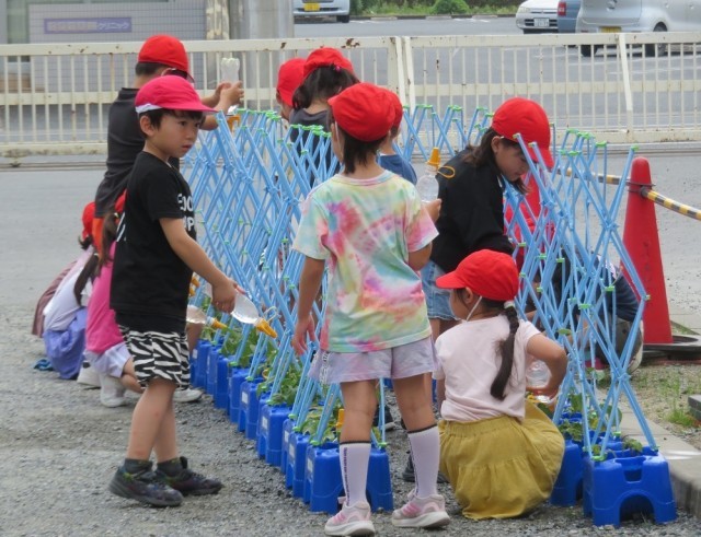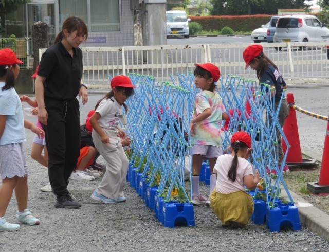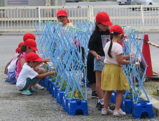 1年生は、生活科であさがおを育てていますが、毎朝の水やりをしているおかげで、ぐんぐんつるが伸びてきました。