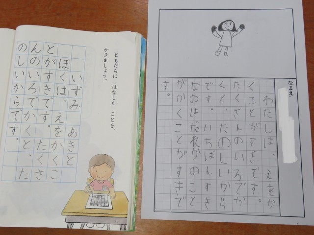 7/4 国語の授業(1) 公開日 2025/07/04 更新日 2025/07/04 できごと 7月4日(金)、1年生は、国語「すきなことなあに」で、一人一人が自分の好きなことを理由も入れて、書いて伝えていました。 。