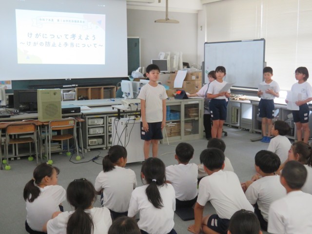 テーマは「けがについて考えよう ~けがの防止と手当~」でした。保健委員がアンケートを集計し、動画を作って、クイズで考えさせました。