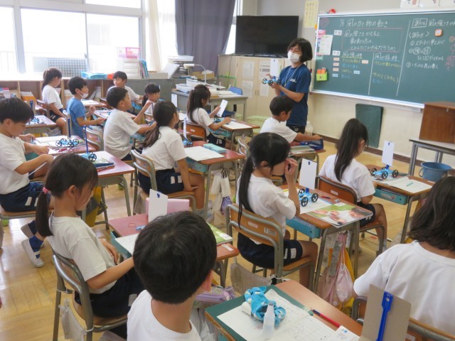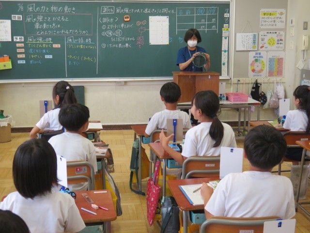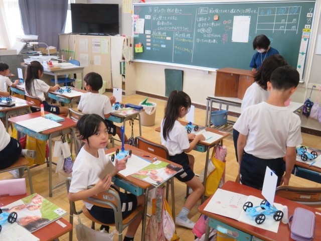 3年生は、理科「風の力と物の動き」で、「風の力を変えると車の動きはどのように変わるか」を予想しました。