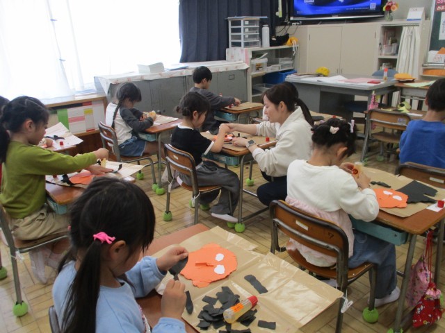 1年生は、自分の顔を色画用紙でつくっていました。はさみは使わないで、自分の手の指...
