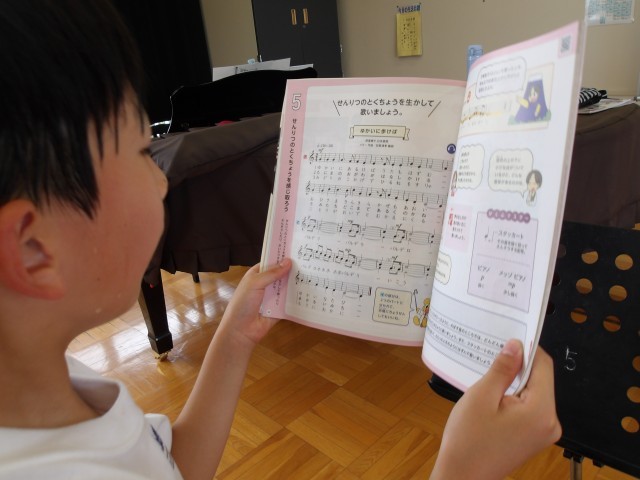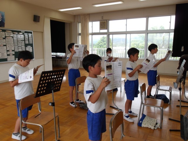 【ゆかいに歩けば】という曲について学習中です。教科書を見ながら、スタッカートや強弱に気をつけて大きな声で歌っていました。