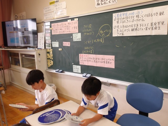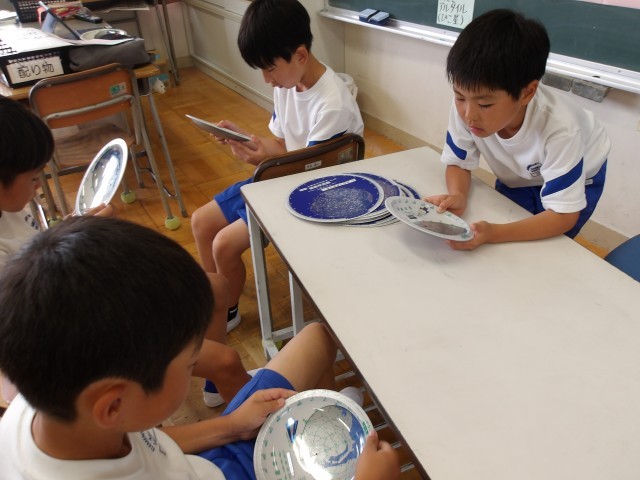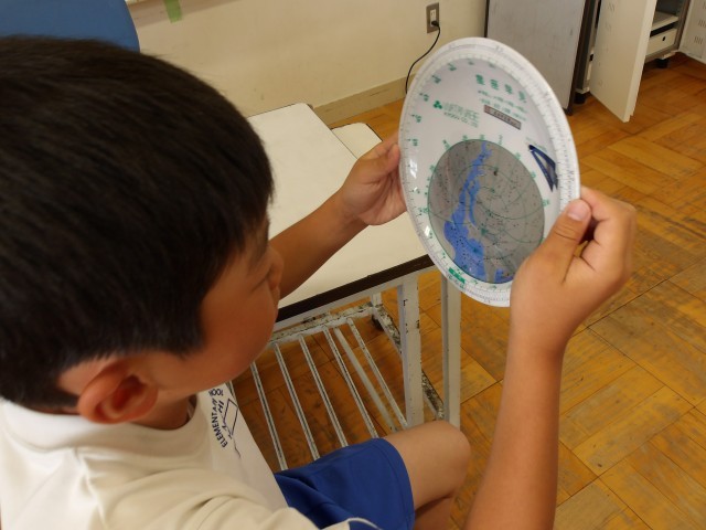 星や星座のことを学習し、星座早見を使っています。まずは方位を確認することが大切で、そのあとは月日の目盛りと時刻の目盛りを合わせて、星座を探していました。ここ何日かは夜空に星が見えないことが多いですが、晴れた日に夜空を見上げて星座を見つけてみましょう。