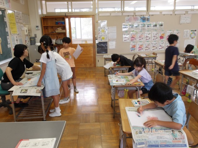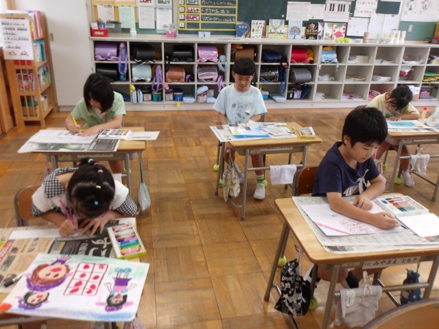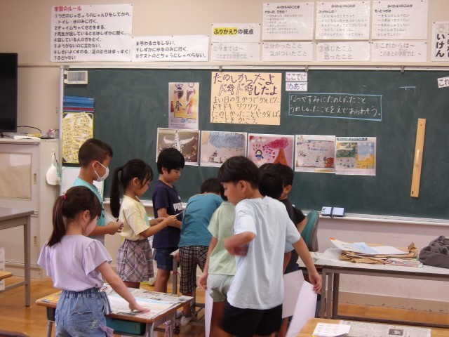 今日のめあては【夏休みに楽しかったこと、うれしかったことを絵であらわそう】です。それぞれが自分の心に残っている夏休みの場面を楽しそうに描いていました。