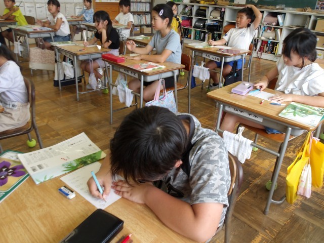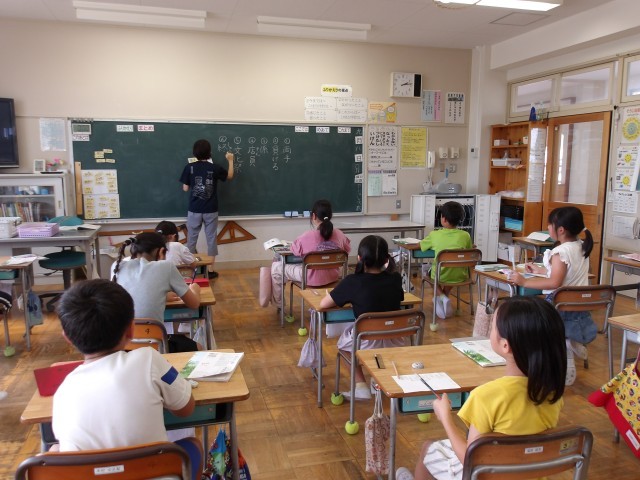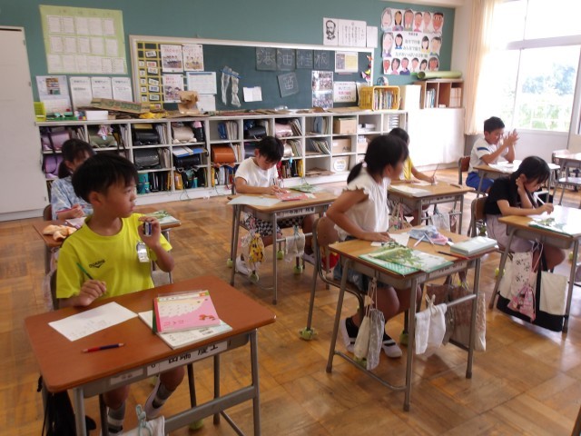 漢字のミニテスト中でした。先生が問題を黒板に書き、それに続いて解答用紙に漢字を書いていきました。「今日習った漢字だ!」「これは簡単!」と言いながら満点を目指して頑張っていました。