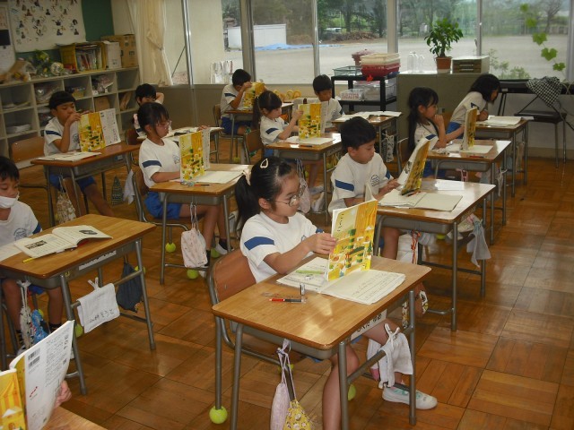 今日のめあては【獣医さんの1日の仕事はどのようなものだろう】と考える授業です。段落ごとに何が書いてあるかをみんなで出し合い、最後にどんなものだったのか、ふり返っていました。獣医さんの忙しさが少しわかったようでした。