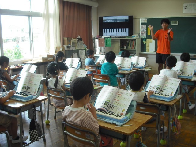 教科書に載っている鍵盤ハーモニカの練習のための曲で練習しています。担任の先生が丁寧に説明をし、今日は【ド】と【ソ】の音を長く伸ばしたり、短く切ったりして音を出していました。