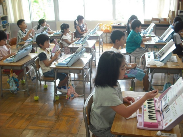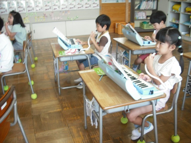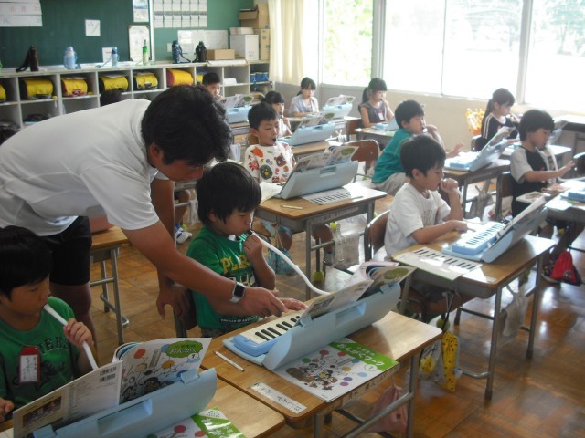 (前の写真の続き)先生に教えてもらいながら、一生懸命吹いたり、歌ったりしていました。