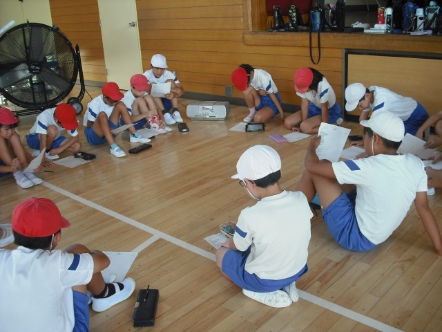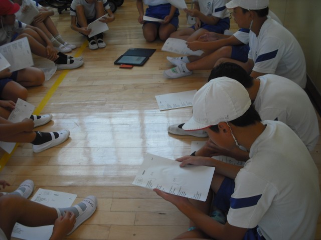 2学期始まって、初めての体育です。今日は【運動会】に向けて各団に分かれ団長や副団長を決め、その後は【表現】に使う音楽を聴いていました。どんなダンスができるか、楽しみです。