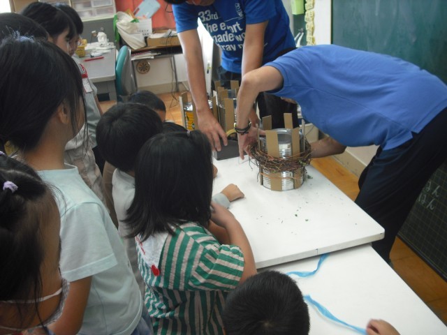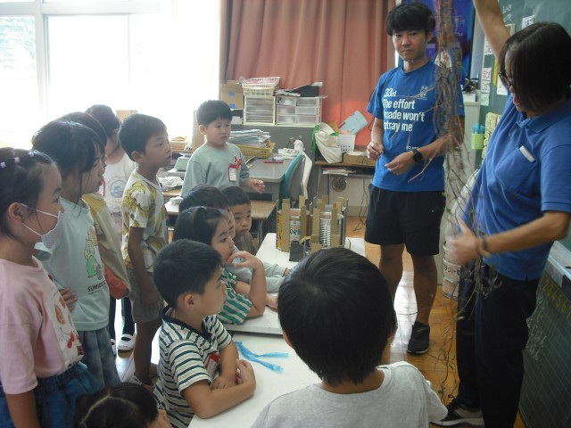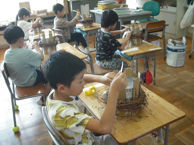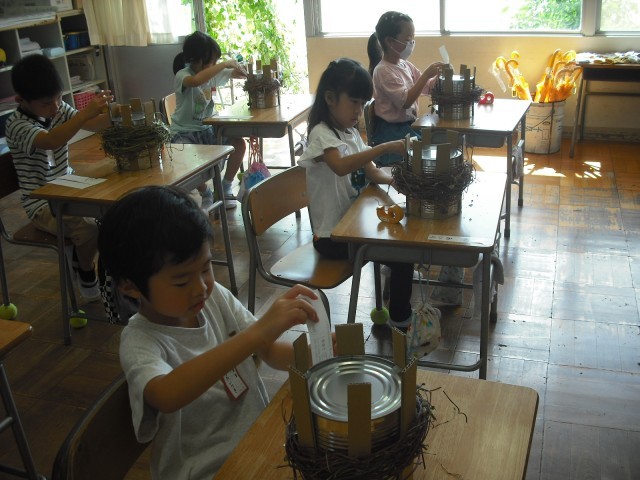 あさがおのリース作りが始まりました。業務員さんが、みんなが同じように作れるようにいろいろ工夫して準備をしてくれました。その道具を使ってどんなふうにするのか説明してもらい、その説明をよく見て、よく聞いて作業をしました。すてきなリースができるといいですね。