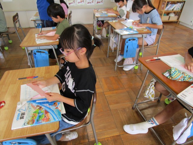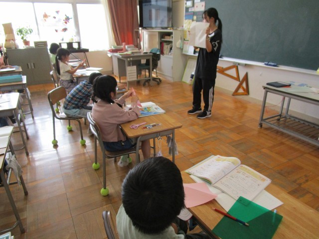 【三角形と四角形】の学習です。紙を切って形を作りました。今日は【四角形】について考えています。どんな特徴があるのか三角定規を使って調べていました。