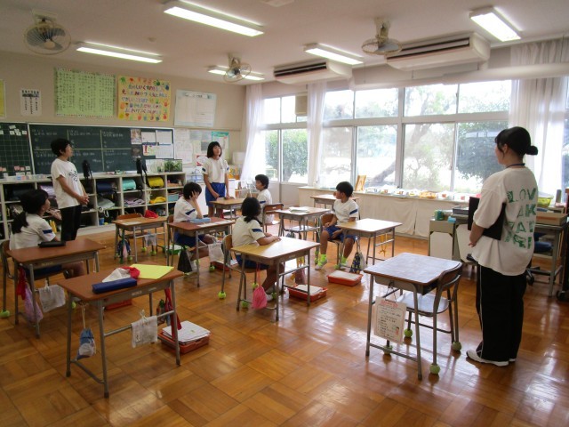 教育実習生が教室に来てくれました。お互いに自己紹介をしてから、実習生に聞いてみたいことを質問しました。みんな笑顔でたくさんの質問をしたり、お話をしたりして交流ができました。