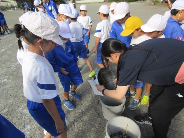 朝、全員で校庭の【石拾い・草むしり】を行いました。南側から一列になって校舎側に進んでいきました。全員で一生懸命やったので、中くらいのバケツに2杯分集まりました。来週はいよいよ運動会です。東小っ子が思いきり走ったり踊ったりできるように校庭も準備が着々と進んでいます。