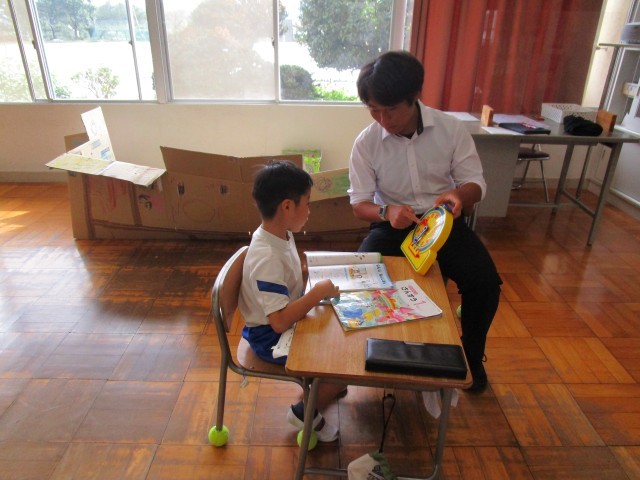【時計】の学習をしています。模型の時計を使って担任の先生と一緒に短い針と長い針の位置を見ています。さて、時計が何時になっているかわかりましたか?