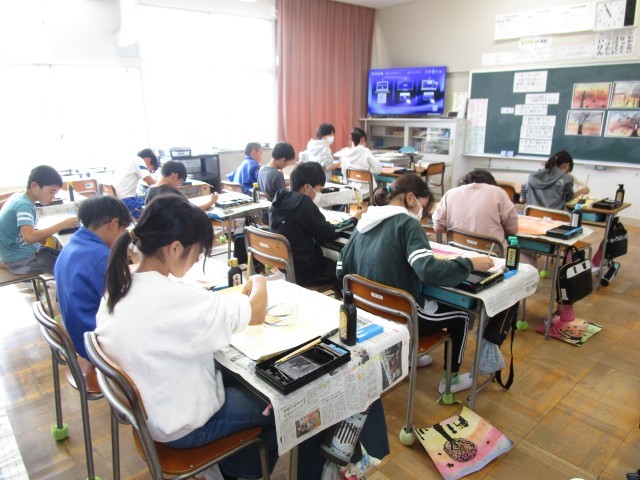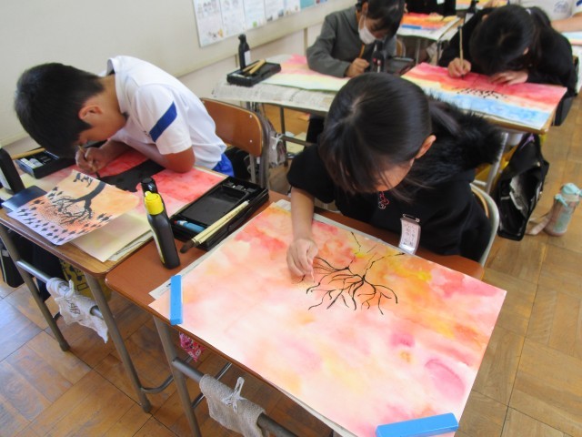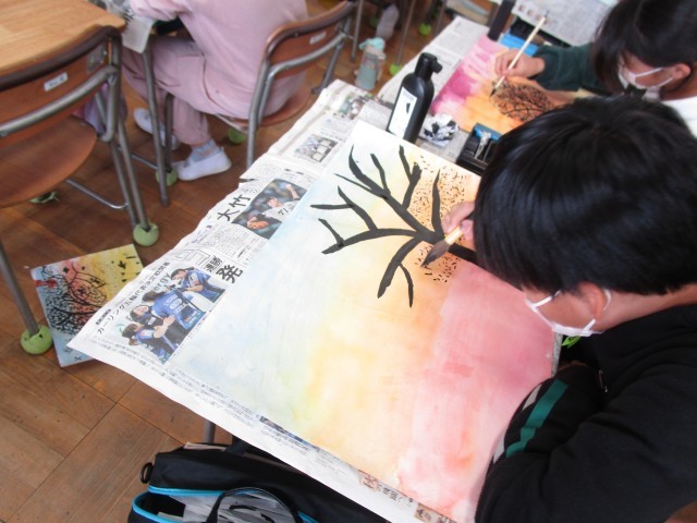 【夕焼け空の樹】の制作中です。背景を時間をかけて塗り、きれいな夕焼け空を描きました。そこに今日は墨を使って樹を描いています。みんな自分の作品に集中していました。