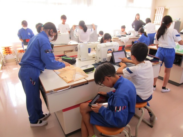 ミシンで【エプロン】を縫い始めています。その前にしつけをして、形を整えて、どこを縫ったらいいのか考えています。ミシンを使うのもだんだんと慣れてきて、次の時間にはさらにスムーズに進められるのではないでしょうか?