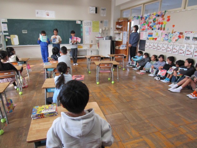 国語の学習の中の一つの活動です。今回は1年生に3年生が紹介したい本をグループごとに発表しました。どれもおもしろそうな本です。読書の秋、いろいろな本を手に取って読んでみましょう。
