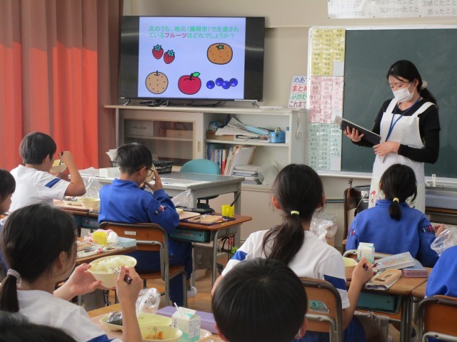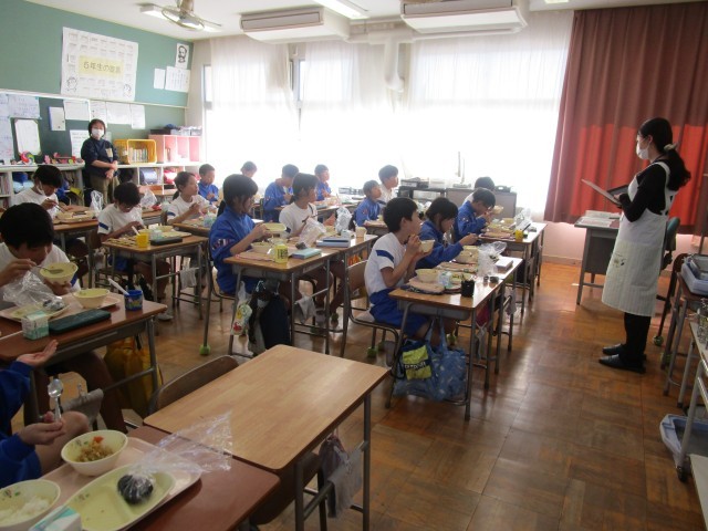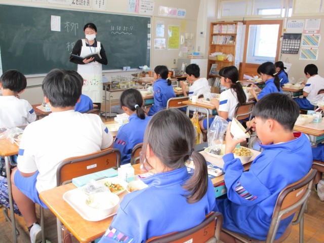 給食センターの栄養士さんが来てくれて食育指導です。今日は【地産地消】という言葉が出てきましたが、5年生は社会で学習したことなので、とてもよく知っていました。地元で作って地元で食べる・・・ことのよさをあらためて知ることができました。