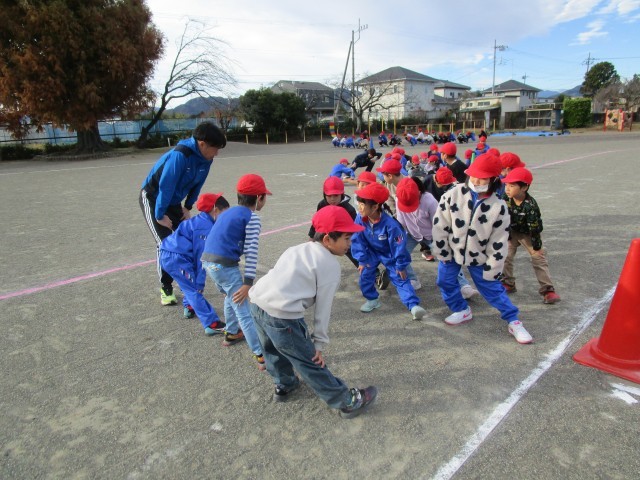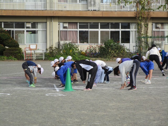 今日の朝から【持久走】が始まりました。最初に先生のお話を聞いて、どんなふうに走るのか、どんなルールがあるのかを確認しました。それから音楽に合わせて学年ごとに準備体操です。