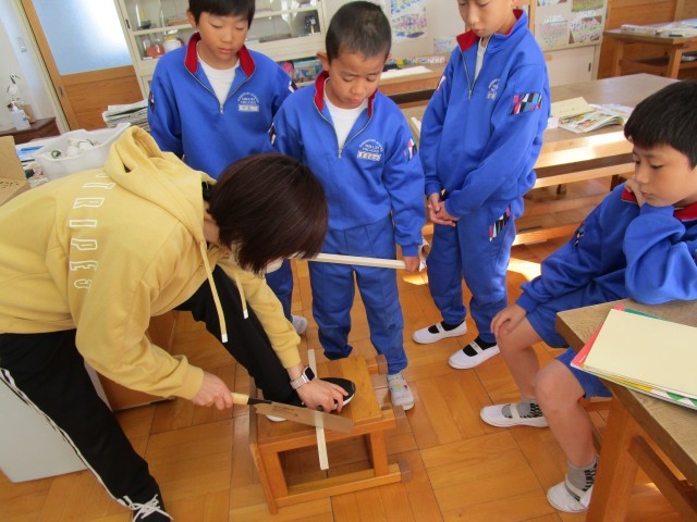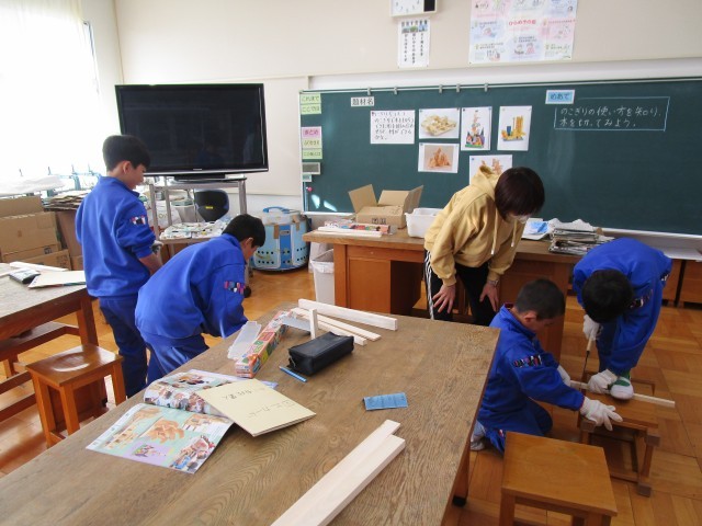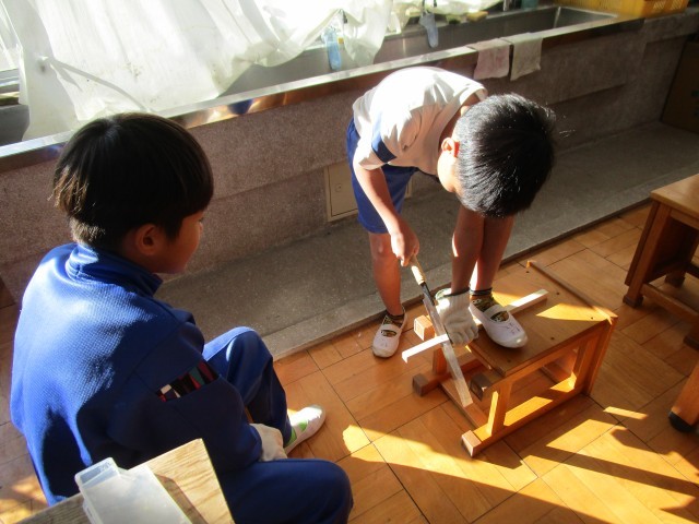 先生のやり方を見て大切なことを聞いてから、のこぎりを初めて使い、木を切りました。初めはなかなか上手に切れませんでしたが、何度かやるうちにリズムよくのこぎりを動かし、木を切ることができるようになりました。次はとんかちを使ってくぎを打つ予定です。そちらもきっと上手にできるようになるでしょう。