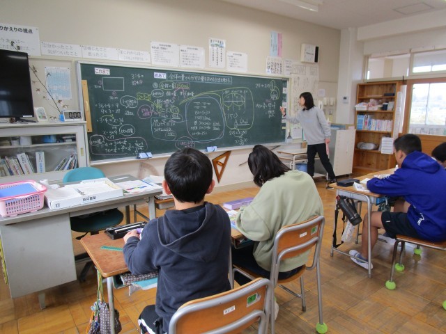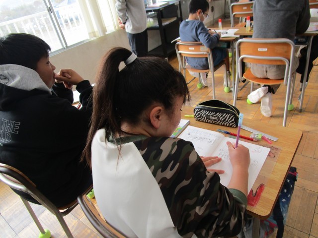 【全体の量から分けた量を求める方法を考える】が今日のめあてです。比の文章問題に取り組んでいました。しっかりと問題を読んでどんな式を立てればよいのかを考えていました。スムーズにできるようになるにはくり返し、問題に取り組むことが大切ですね。