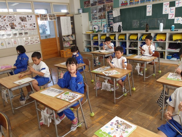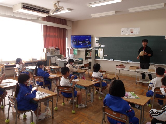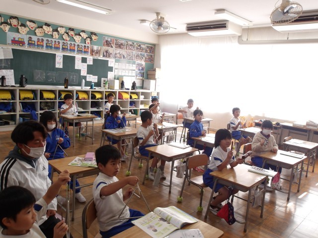 リズムの学習です。先生のタンバリンのリズムに合わせて、トライアングルや鈴を上手にならします。とても楽しくできたようです。