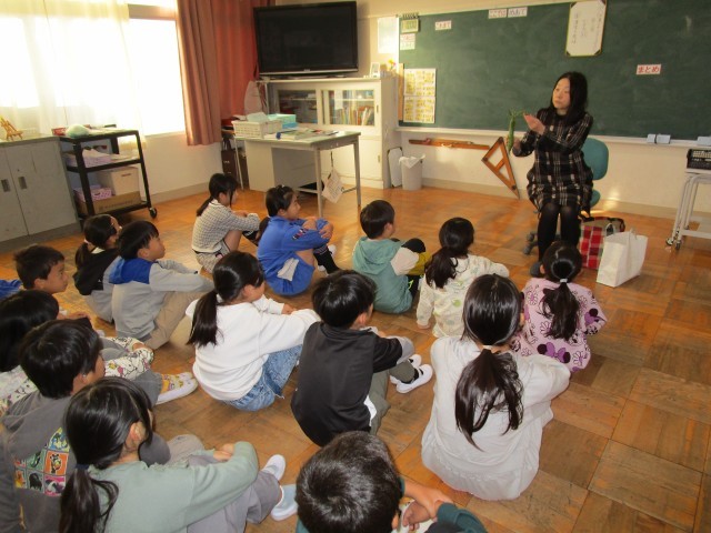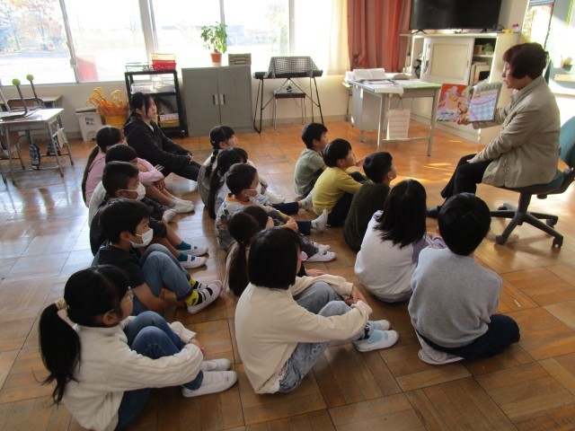 11月の読み聞かせです。いつもはたくさん字のある本を読んでいる高学年もこのときは絵本の世界に入り込んで、じっとお話に耳を傾けていました。