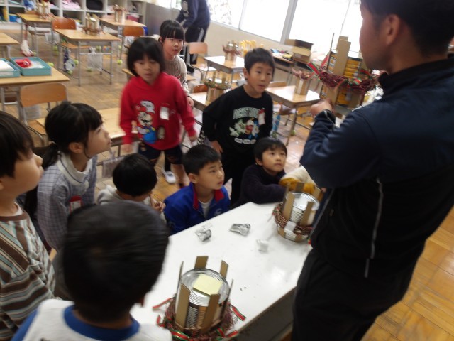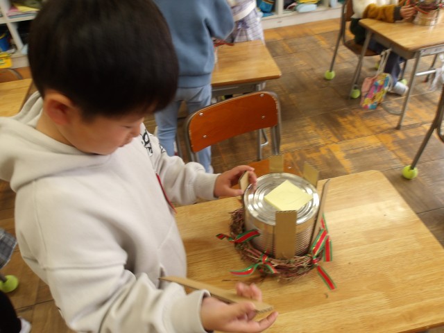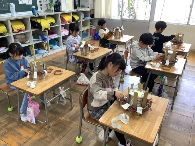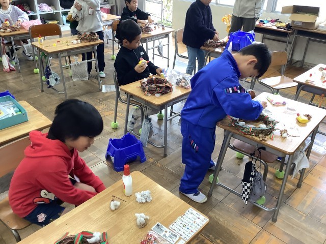 アサガオのつるで作ったリースを型から外し、学校で拾った松ぼっくりやお家から持ってきた飾りをリースにつけました。かわいいオリジナルのリースができあがりそうです。