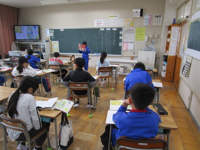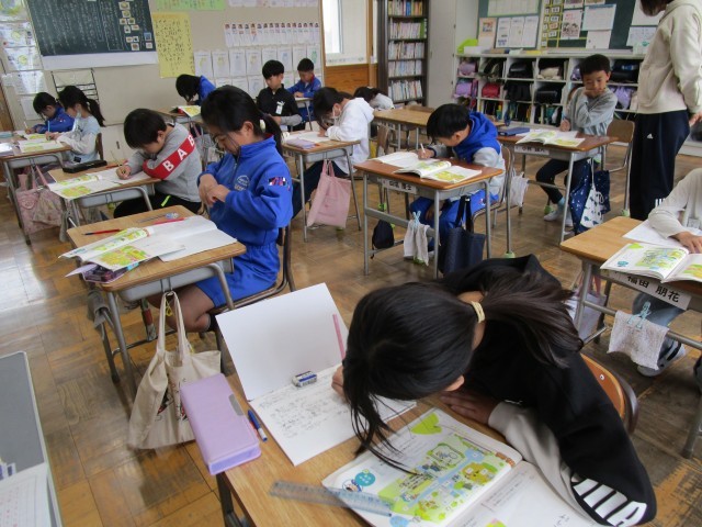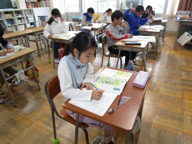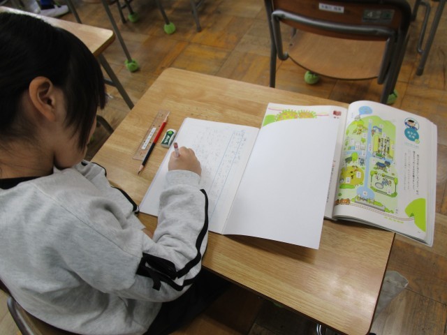 教科書の【漢字の広場】を見て、絵の中の町に住んでいるつもりで町の様子を説明する文を書きました。漢字は2年生の時に習った漢字なので得意顔で書いています。どの子も上手に漢字を使って、説明する文が書け、最後はみんなの前で発表しました。