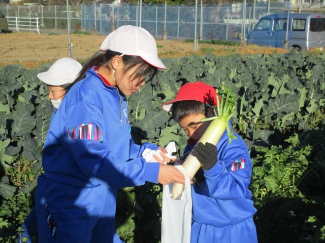 今回は大きな大根とかぶなどをとりました。1年生は、やさしくて頼りになる6年生と一緒にとれたこともうれしくて、ニコニコ笑顔でした。お家でおいしく食べてくださいね。