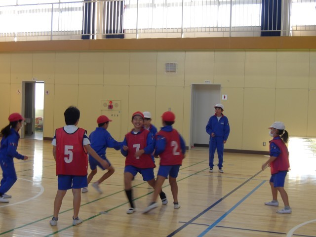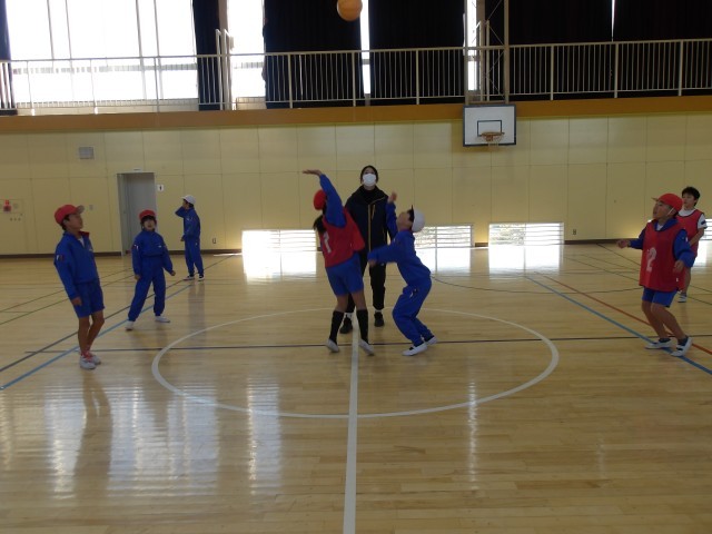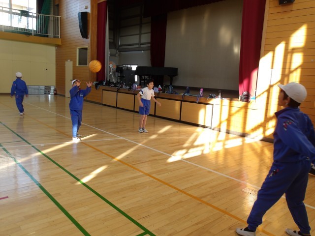 ポートボールの授業です。パス、ドリブルの練習をしたあとに実際に試合を行いました。全員がボールに触れてから点が入るので、パスを出す場所などを考えて取り組んでいました。