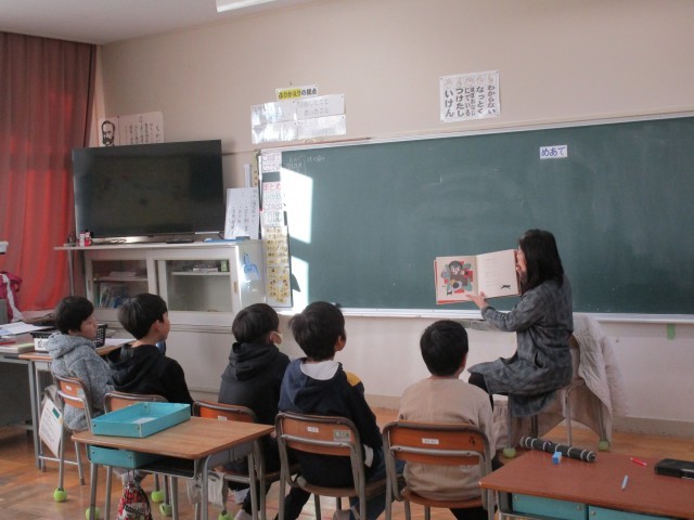 今年最後の読み聞かせです。絵本を見ながらじっくりとお話を聞いています。冬休みも5冊まで図書室で借りられるので、ぜひお家でも本を読む時間を作ってくださいね。